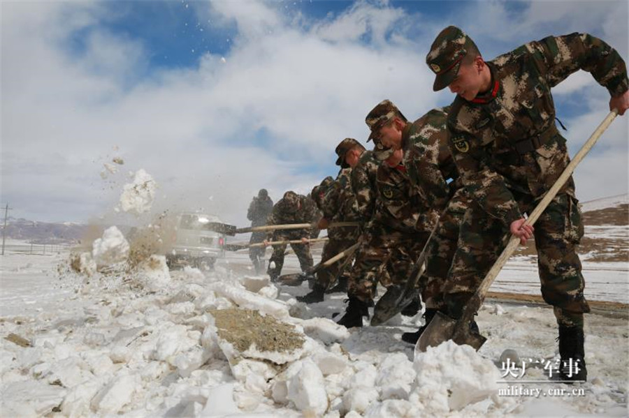 武警官兵奋力铲除道路积雪。赵晓川摄