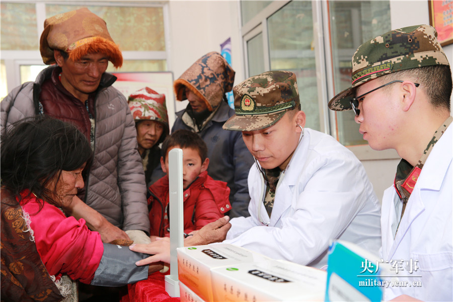 2月22日,武警青海省总队玉树支队军医吕超、卫生员易海山为受灾严重的珍秦村村民进行义务诊疗、赠送药品。赵晓川摄