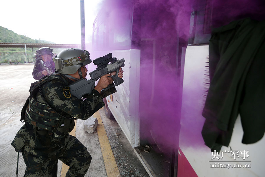 特战队员在烟雾的掩护下突入车辆。
