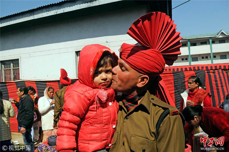 当地时间2019年3月9日,印控克什米尔斯利那加,查谟克什米尔轻步兵团(JKLIR)的152名新兵在当地军事基地参加阅兵仪式后正式加入陆军,与亲人拥抱庆祝。图片作者:Hindustan Times/视觉中国