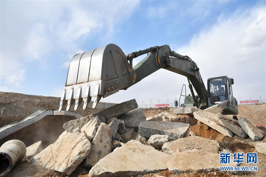 3月11日,武警战士进行塌方体清理演练。新华社记者 陈斌 摄