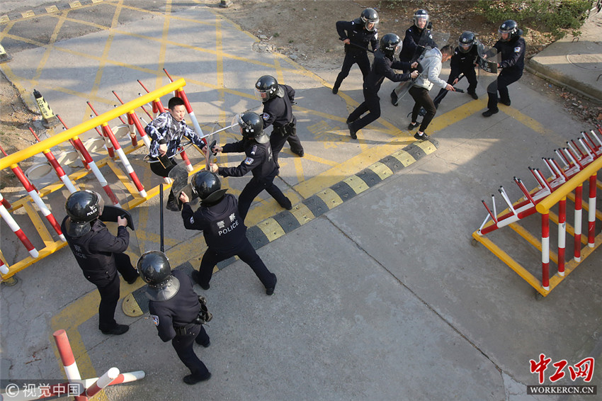 2019年3月12日,江苏省连云港市公安局开发区分局边防大队民警冲出营门对“暴恐分子”实施抓捕。图片作者:郑永波/视觉中国