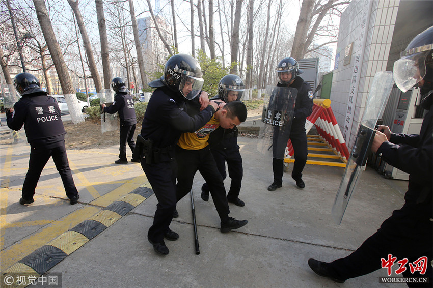 2019年3月12日,江苏省连云港市公安局开发区分局边防大队民警将抓捕到的一名“暴恐分子”带离现场。图片作者:郑永波/视觉中国
