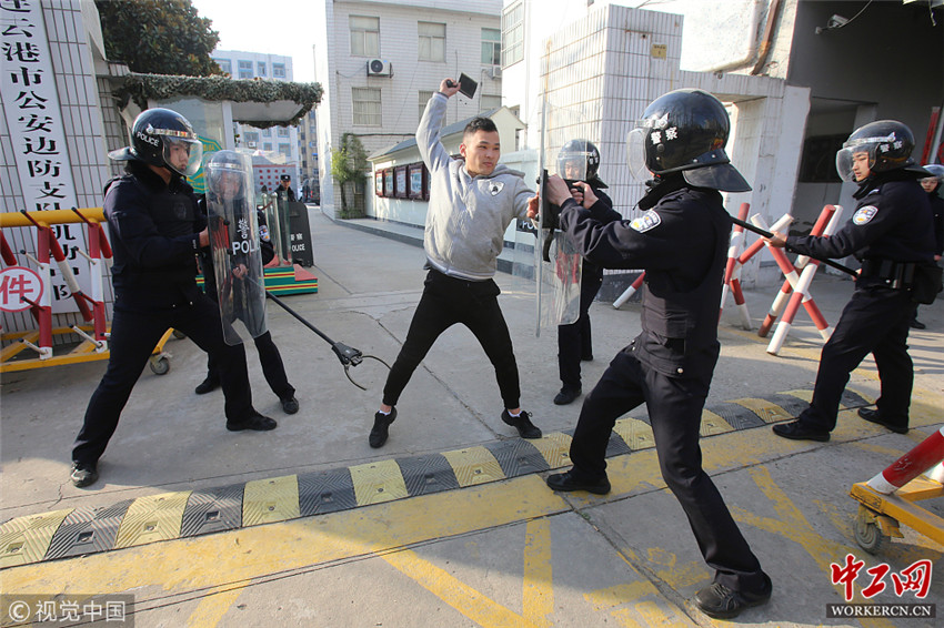2019年3月12日,江苏省连云港市公安局开发区分局边防大队民警在营门口对疯狂冲击民警的“暴恐分子”实施抓捕。图片作者:郑永波/视觉中国