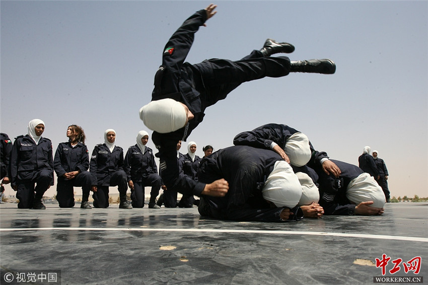 2008年8月21日,约旦Muwaqqar,约旦女警察进行徒手对抗训练。这个安曼的女子警校于1972年建立,使约旦成为阿拉伯世界首个招收女子为警察的国家。这些女警毕业后可以从事名人保镖、特种兵、女交警等职业。