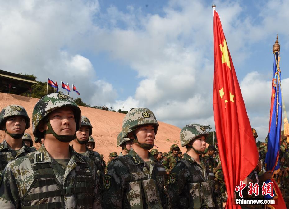 3月13日,中国和柬埔寨两军“金龙-2019”联合训练在柬埔寨贡布省王家军步兵70旅综合训练场举行开训仪式。据悉,这次联训从3月10日至27日,以“反恐联合训练暨人道主义救援”为主题,分为技能训练、战术训练、沙盘和实兵推演、实兵实弹演练4个阶段。中方部队主要由南部战区陆军机关和第74集团军抽组而成,共252人,包括特战、陆航、工兵、炮兵、装甲兵等多个兵种力量,参训装备包括直升机、装甲车、火炮、轻武器以及侦察、反恐等相关装备器材。期间,将组织双方参训分队向当地村民捐赠生活、学习物资和巡诊送药等人道主义救助活动。图为中方参训官兵(右一为女兵)。中新社记者 黄耀辉 摄