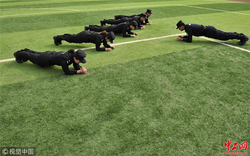 3月5日,内蒙古呼和浩特市,三名“90后”女狙击手郝瀚钰、付一宁、刘姣与男特警队员们进行体能训练。