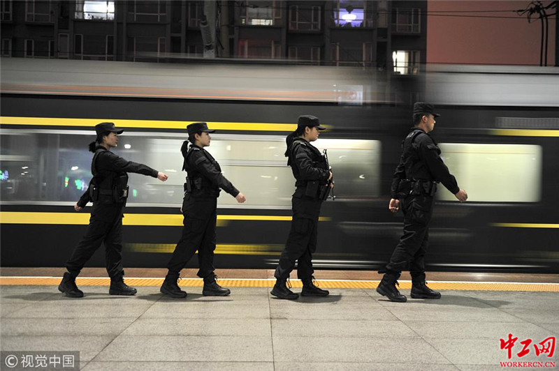 3月5日,内蒙古呼和浩特火车站,三名“90后”女狙击手郝瀚钰、付一宁、刘姣同男特警队员们一起巡逻。