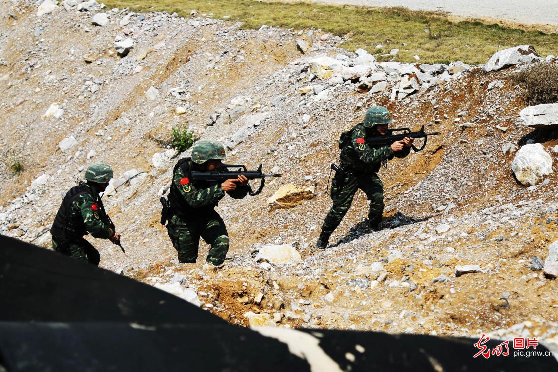 2019年3月11日至3月14日,武警广西总队桂林支队组织特战队员在桂林郊区某矿山进行野外驻训。据悉,此次野外驻训坚持"任务牵引、训战一致"的原则,开展反恐、捕歼战斗、抢险救援等训练。图为3月12日,特战队员在进行战术搜索训练。(张宸硕摄/光明图片)