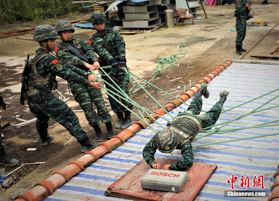 3月18日,武警广西总队第四片区“魔鬼周”极限训练在广西防城港市某陌生地域拉开战幕。开训首日,特战队员们就进行了五公里山地越野、荆棘排雷、长途行军、乘舟射击等科目的训练。图为3月18日,武警广西总队特战队员在进行协作“排雷”。崔程 摄