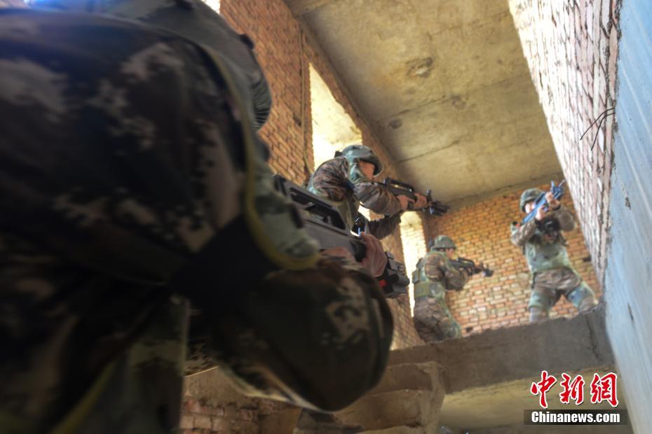 近日,武警山西总队忻州支队组织特战队员开展野外极限训练,通过采取挑战生理极限、心理底线、技能顶点的训练形式,进一步提高特战队员在艰苦环境和极端复杂条件下的智、体、技、战综合能力。图为特战队员在反恐作战演练中进行楼房搜索。袁浩翔 摄