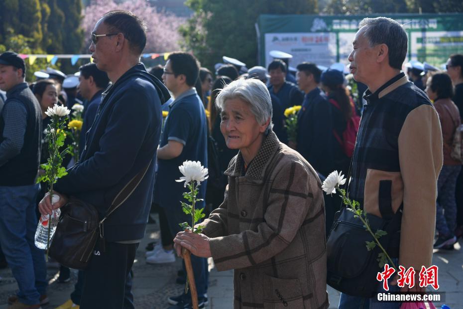 3月23日,民众在远征园排队为英烈献花。当日,“万朵菊花献英烈”活动在昆明金陵陵园远征园举行,这里安葬着多位远征军、南侨机工和抗战老兵,各界民众前往祭扫、缅怀先烈。 中新社记者 任东 摄