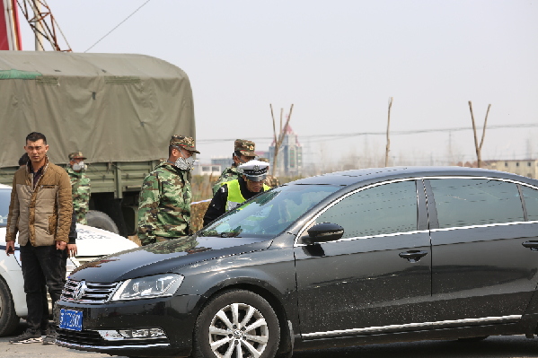 2019年3月23日,正在执行卡点任务的武警江苏省总队任务官兵正在对来往车辆进行询问检查。陈锋 摄
