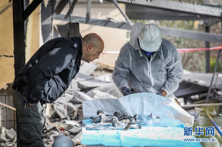 3月25日,在以色列特拉维夫以北一处居民区,调查人员检查被火箭弹损毁的房屋。 当日,以色列遭遇火箭弹袭击,造成7人受伤。 新华社/基尼图片社