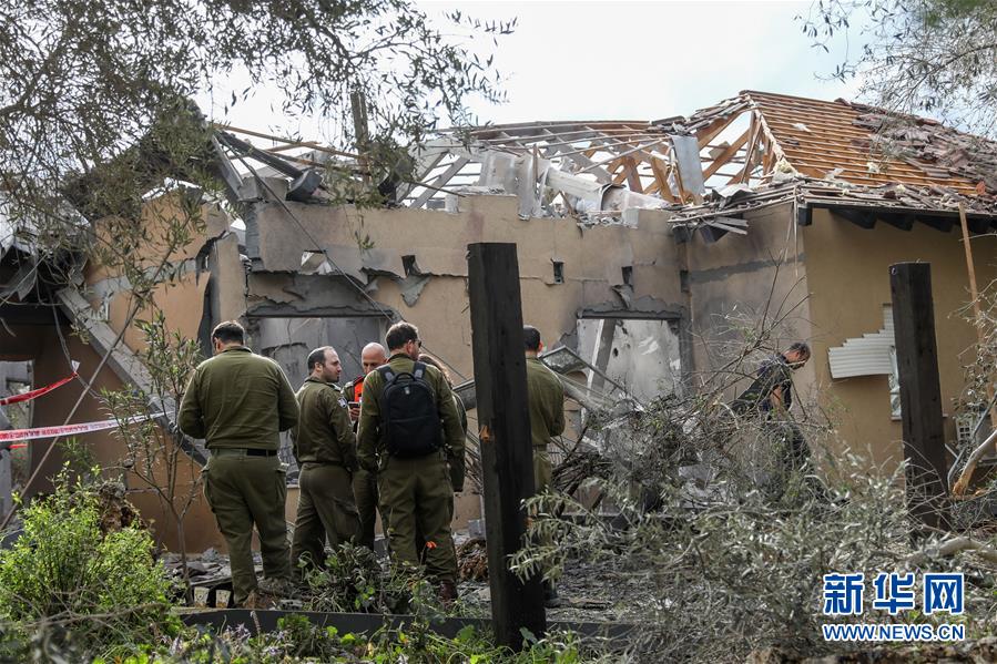 3月25日,在以色列特拉维夫以北一处居民区,调查人员检查被火箭弹损毁的房屋。 当日,以色列遭遇火箭弹袭击,造成7人受伤。 新华社/基尼图片社