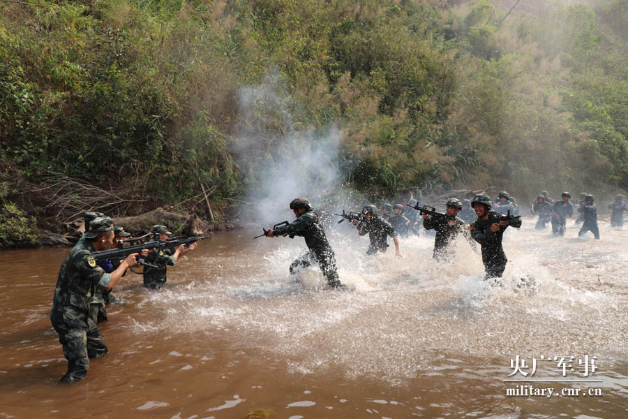 特战队员峡谷涉水追击。