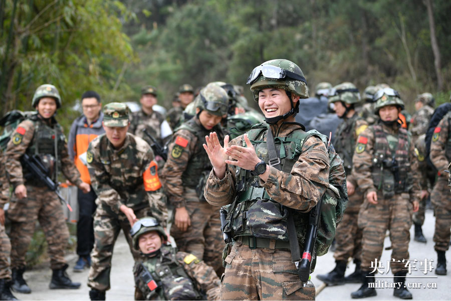 在体能对抗训练中,一名特战队员听到自己的小队成绩靠前,笑得合不拢嘴。(唐志勇摄)