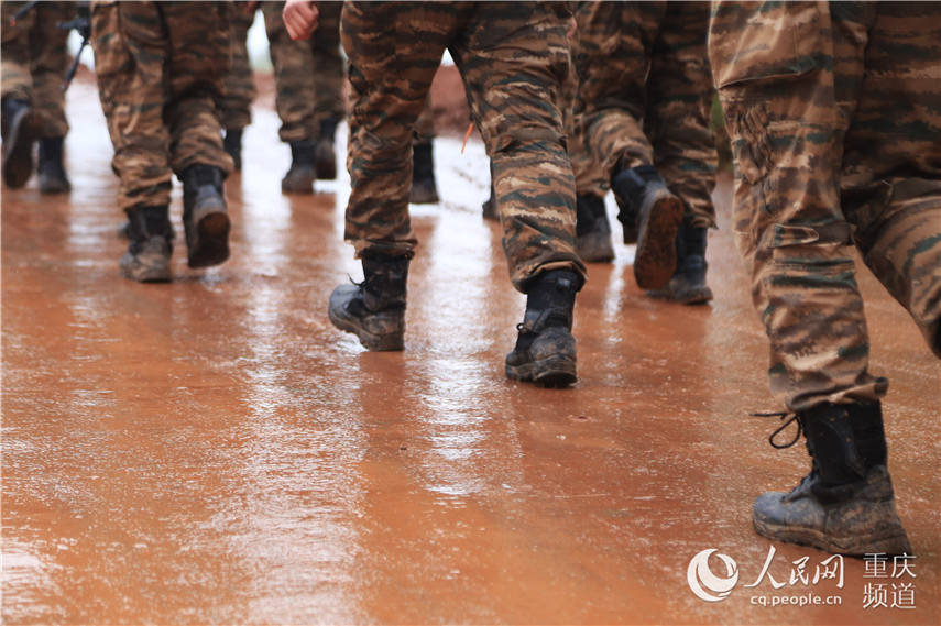 连续的暴雨天气让道路泥泞湿滑,踏响的水花,飞起的泥点,都是特战队员脚步下的交响乐。