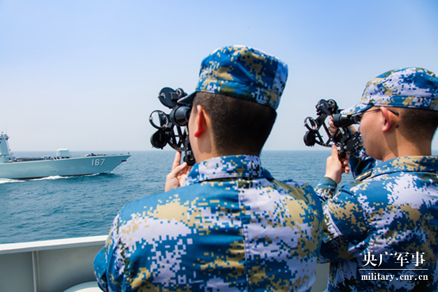 在舰艇编队补给占位训练中,航海干部测定目标运动要素。