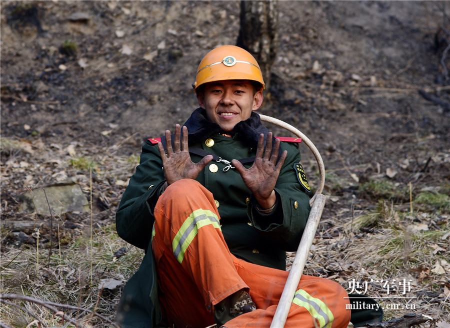 4月3日早,一夜奋战后,武警山西总队某部战士刘安笑着给记者看他的双手。张志远摄