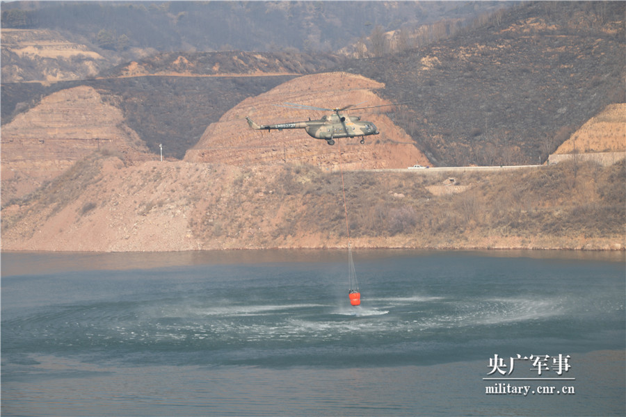 4月1日,83集团军某空中突击旅直升机在紫红河水库吊桶取水,对火场区域进行空中吊桶洒水作业。徐君强摄