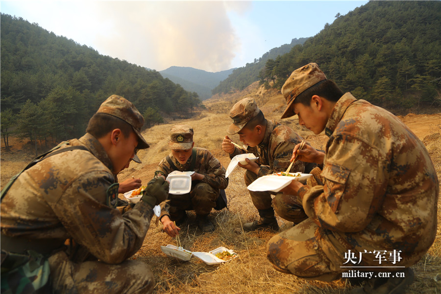 经过一上午的奋战,83集团军某工化旅战士们在火灾救援现场进行简单就餐。餐后,已将垃圾回收。谢桂洲摄