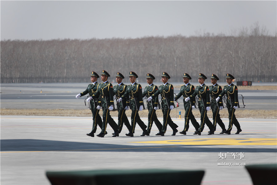 礼兵持棺椁架准备登机迎接烈士英灵