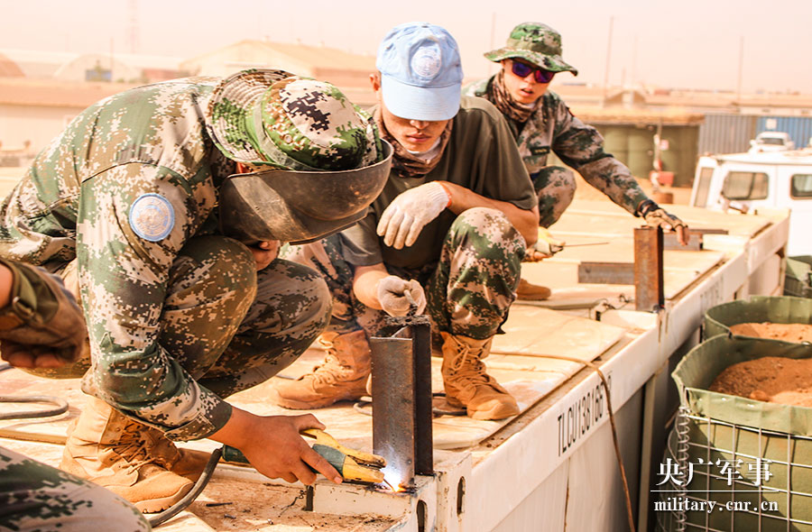 分队官兵利用废旧板房和钢材自行设计并制作“高架观察哨楼”。陈鹤 摄