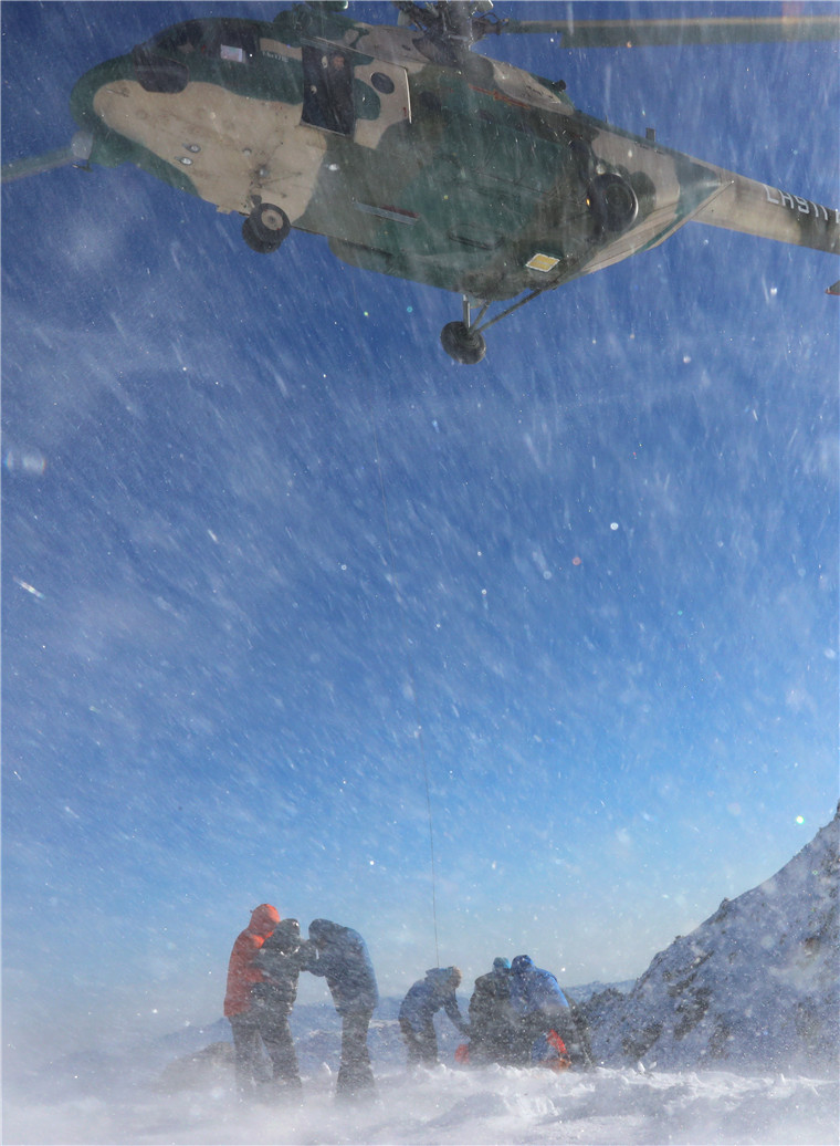 救援直升机在被困人员上方悬停后,利用吊篮迅速放下2名搜救队员,并成功将1名被困人员救上直升机。但此时机组发现救援地势较陡,被困人员行动不便,采取吊篮救援所有被困人员需要较长时间,影响后续行动。时间紧迫,机组决定采取超低高度悬停救援,将轮子轻轻贴在雪山顶上。在官兵帮助下,被困人员一一被救上直升机。