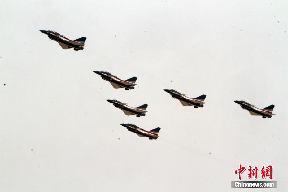 4月12日,第四个全民国家安全教育日到来之际,空军八一飞行表演队在天津为公众进行飞行表演,也拉开了中国空军2019年航空开放活动的序幕。图为八一飞行表演队的歼十飞机在空中进行特技表演。中新社记者 张道正 摄