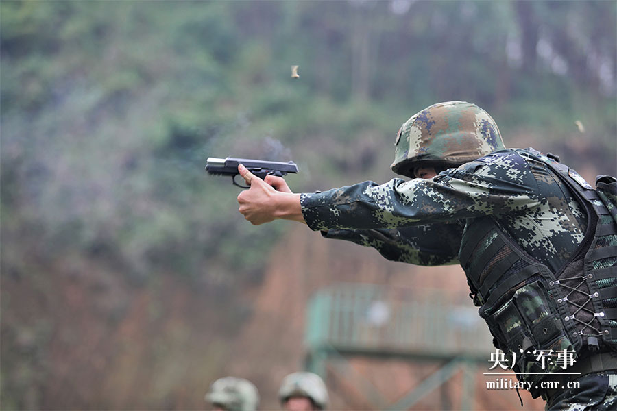 一名武警官兵手枪快速射击子弹出膛瞬间