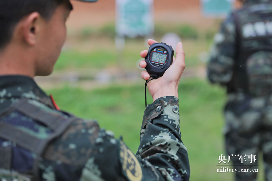 一名武警官兵用秒表记时