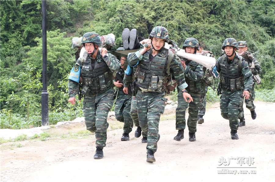 在战场上,流血受伤在所难免,快速救护搬运伤员也是特战队员一项常见的训练科目,以全装12人小队为单位,在不超过20分钟的时间内用简易担架将伤员搬运3公里,期间不能休息、伤员不能着地。