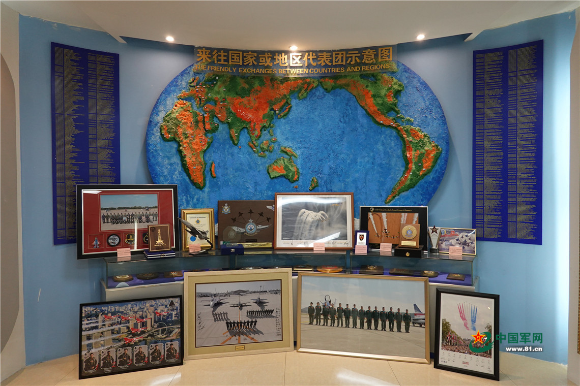 荣誉室的这幅世界地图记载着八一飞行表演队为160多个国家和地区的700多个代表团进行了600余场飞行表演。柳军 摄