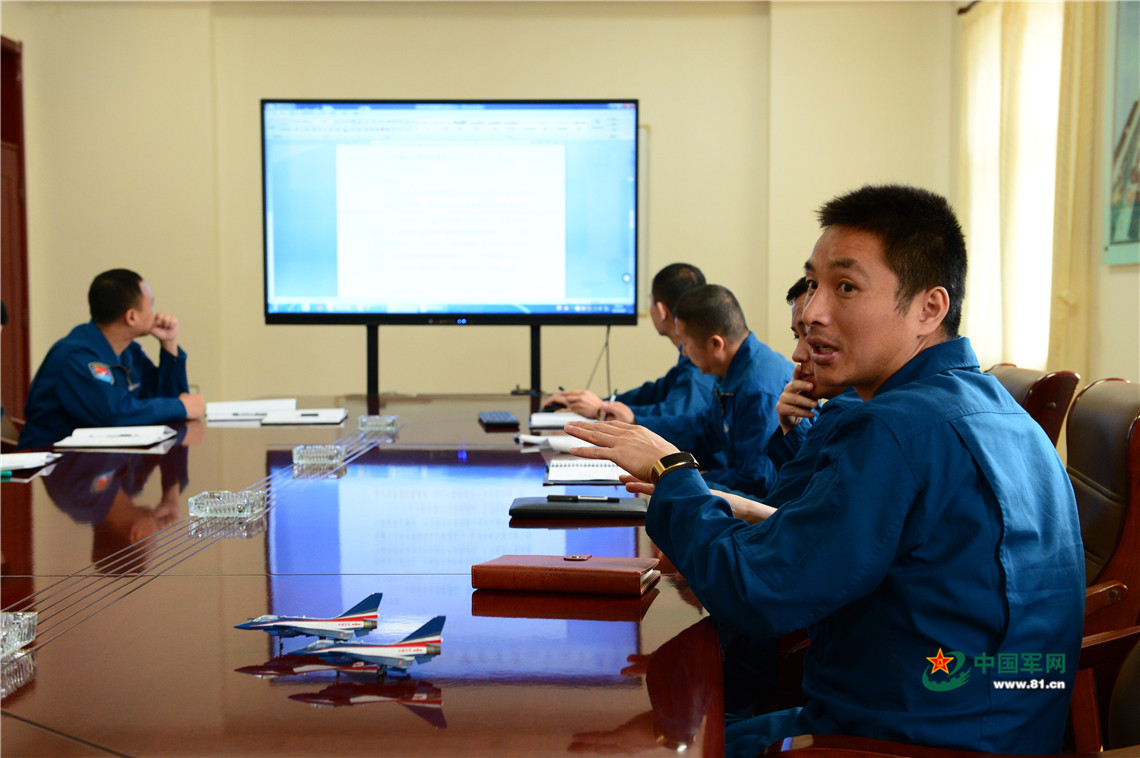 4月9日,八一飞行表演队副队长李斌就他负责的课题与其他飞行员进行思想碰撞。柳军 摄
