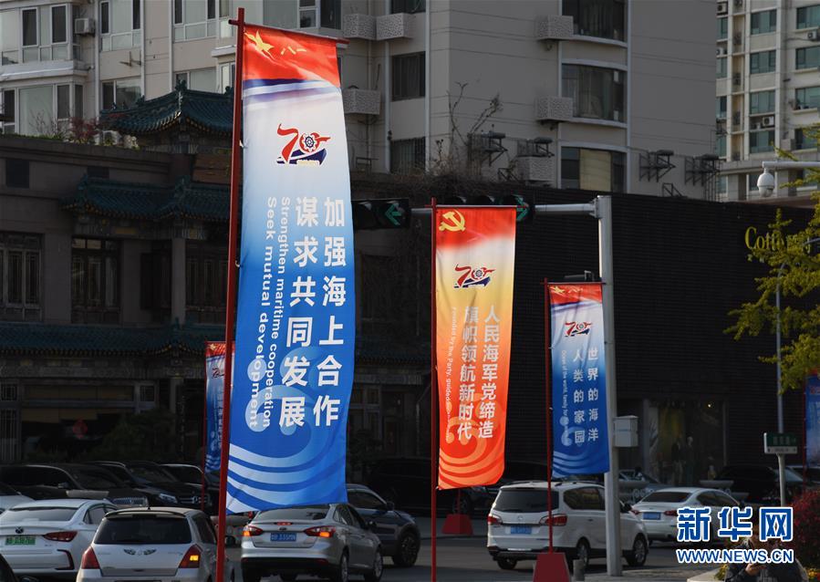 近日,青岛市主城区部分街道和建筑装扮上了中国人民解放军海军成立70周年纪念日和人民海军成立70周年多国海军活动相关宣传标语,营造出庄重喜庆的氛围。