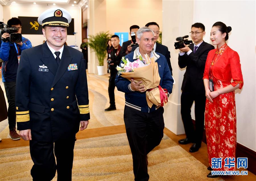 4月20日,阿根廷海军代表团团长、海军参谋长何塞·路易斯·比利安(前右)抵达山东青岛。 新华社记者 朱峥 摄