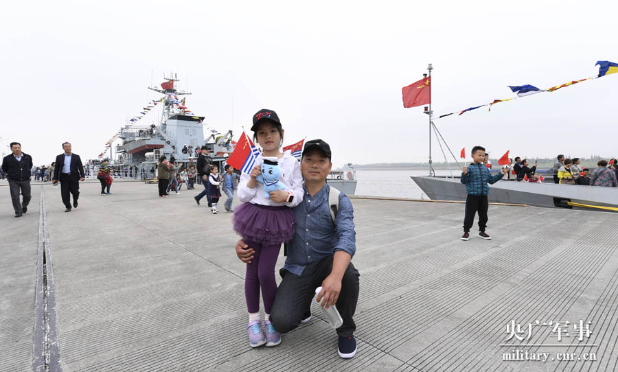 安徽铜陵小朋友陈媞在爸爸的带领下手持海军旗,驱车近千里来到上海。登舰时,海军叔叔向她赠送了舰帽和海军吉祥物。(刘勇 摄)