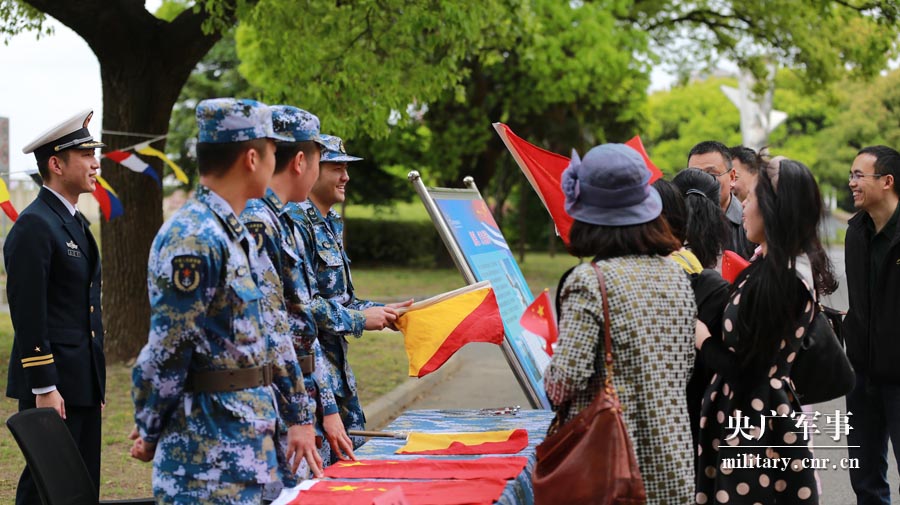 4月20日,市民群众观看学习海军特色科目展示,向官兵学习了解旗语。(黎宇 摄)