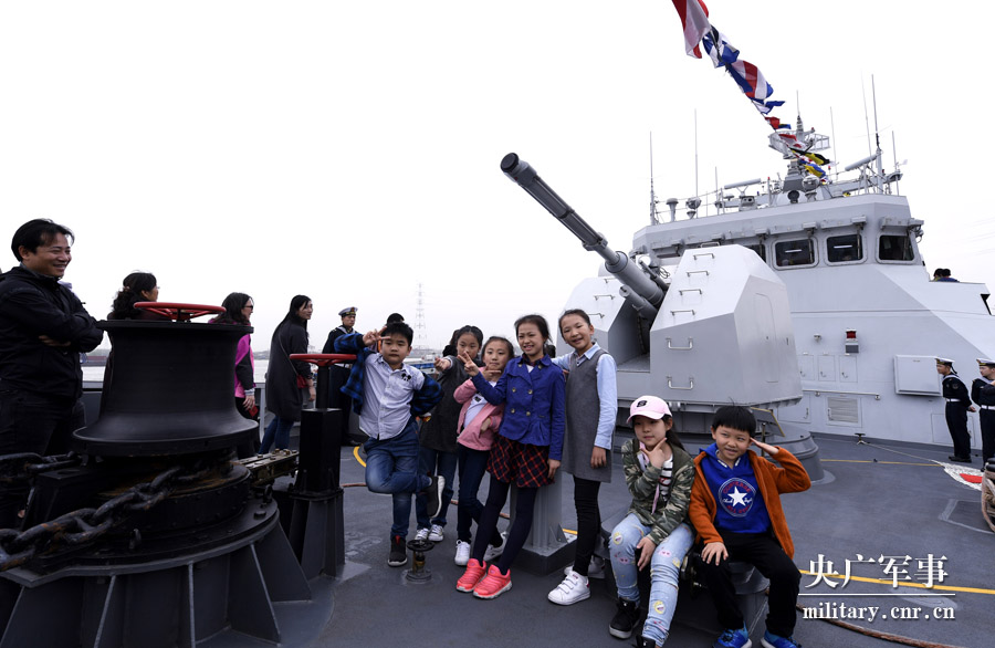 4月21日,前来参观的驻地学生与舰艇合影。(刘勇 摄)
