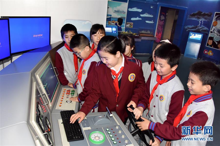 4月22日,学生们在学校海洋馆模拟舰艇驾驶。当日,青岛嘉峪关学校组织海军知识科普课堂活动,师生们通过海军历程回顾、舰艇知识学习、旗语祝福等形式迎接人民海军生日的到来。新华社记者 李紫恒 摄