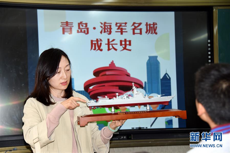 4月22日,孔令仪老师在给学生们讲解舰艇知识。当日,青岛嘉峪关学校组织海军知识科普课堂活动,师生们通过海军历程回顾、舰艇知识学习、旗语祝福等形式迎接人民海军生日的到来。新华社记者 李紫恒 摄