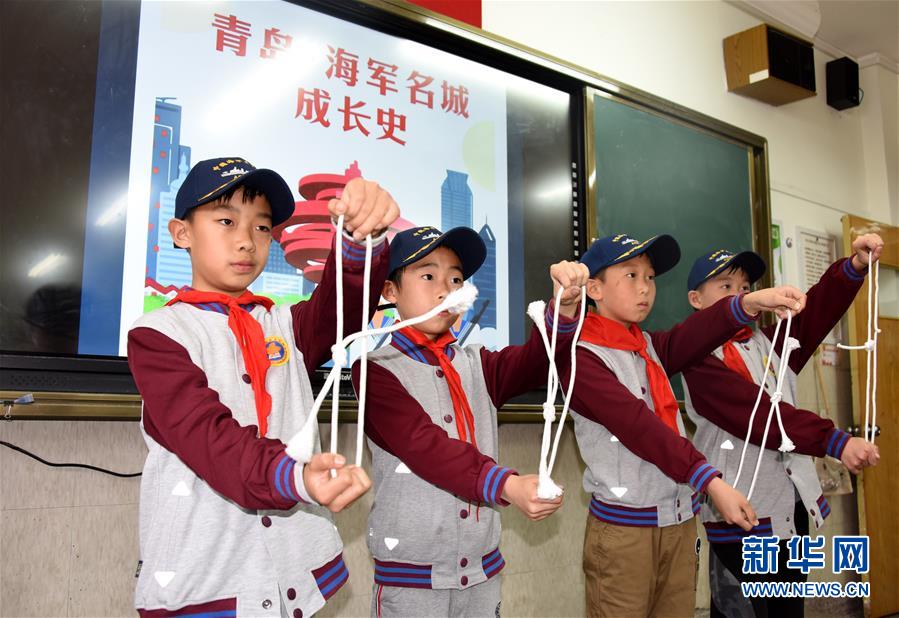 4月22日,学生们在展示打好的水手结。当日,青岛嘉峪关学校组织海军知识科普课堂活动,师生们通过海军历程回顾、舰艇知识学习、旗语祝福等形式迎接人民海军生日的到来。新华社记者 李紫恒 摄