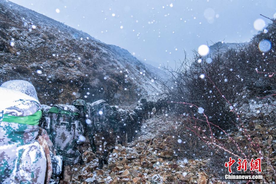 近日,西藏军区某旅开展高寒山地综合演练时,在海拔5300米的高山之上,邂逅一场大雪。不期而遇的大雪也为这场陌生地域条件下开展的高寒山地综合演练增添了“戏份”。据悉,此次综合演练跨昼夜27小时,参训官兵山路行军超过50公里,海拔爬升超过1000米,翻越最高的山峰海拔达到5300米,行军负重超过30公斤。同时在演练过程还需完成单兵掩体构筑、崖壁攀登、冰川攀登、伏击与反伏击、夜间战场救护、5公里山地越野等8个科目考核。图为参训官兵大雪中行军。张连清 摄