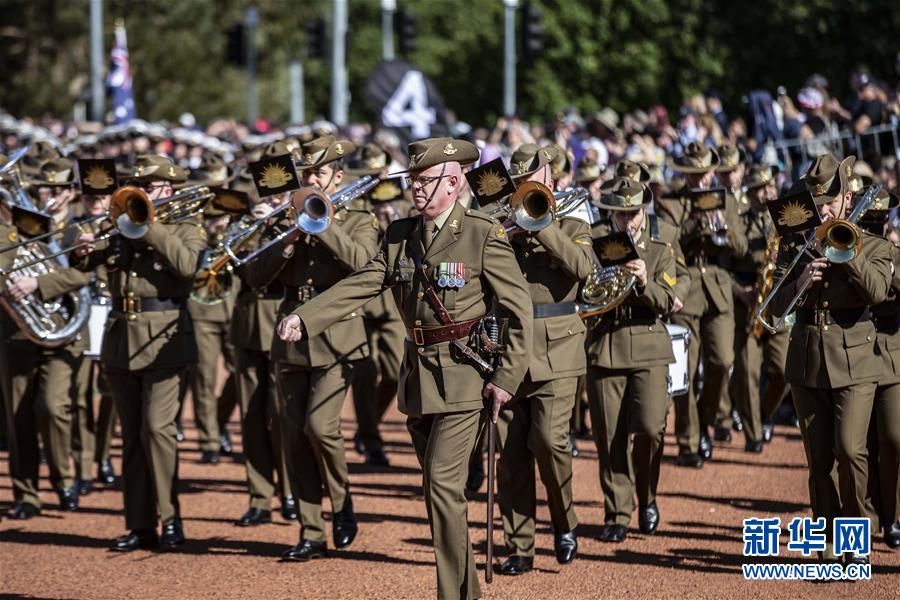 4月25日,在澳大利亚堪培拉的国家战争纪念馆,军乐团在国家仪式中走入纪念馆广场。新华社发(潘翔越 摄)