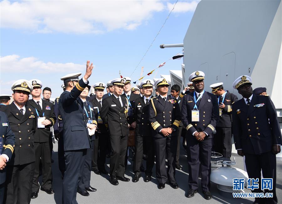 4月25日,海军代表团团员在“贵阳”号导弹驱逐舰上参观。 当日,参加庆祝中国人民解放军海军成立70周年多国海军活动的海军代表团登上中国部分海军舰船参观,并与中国海军官兵交流。 新华社记者李紫恒摄