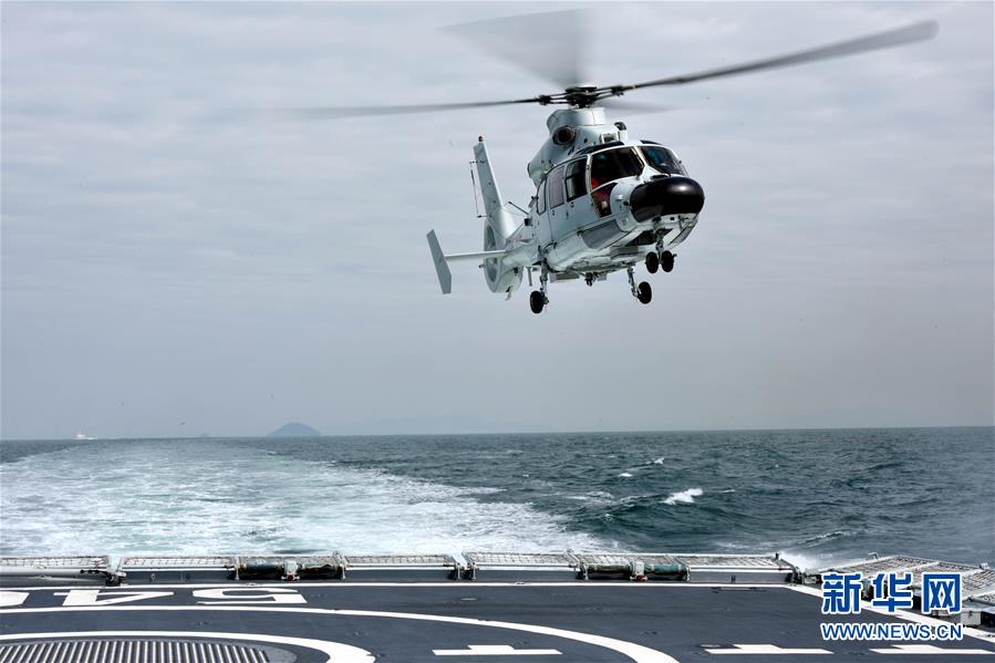 4月26日,一架参加演习的直升机在中国海军盐城舰上降落。 当日,中国—东南亚国家“海上联演—2019”在青岛某海域举行。参加此次演习的有中国、泰国、菲律宾等7个国家,参演兵力包括13艘舰艇、4架直升机。据介绍,演习以联合应对海盗威胁和海上应急医疗救援为课题。 新华社记者 李紫恒 摄