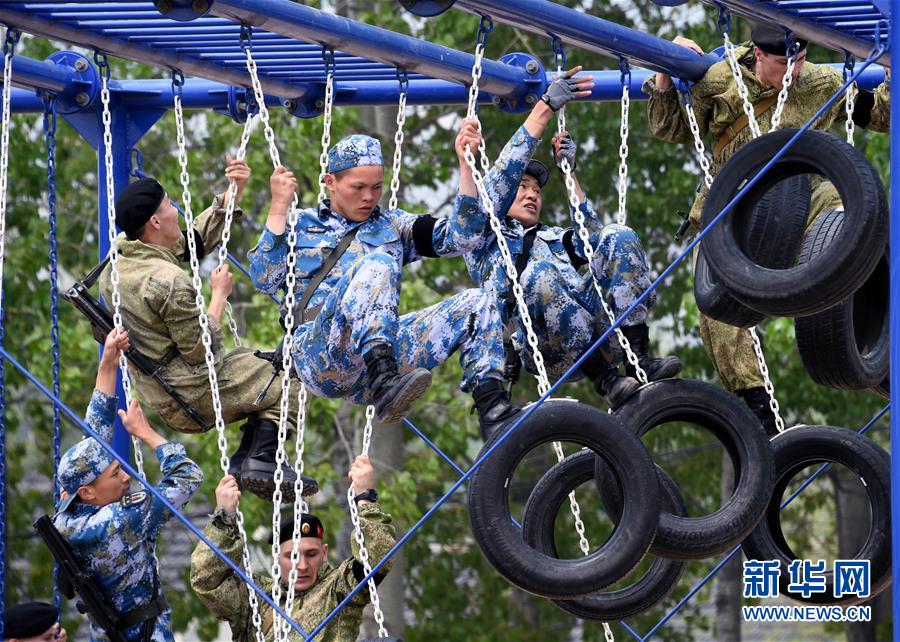 4月30日,中俄海军陆战队员在400米越障竞赛中。 当日,中俄“海上联合—2019”军事演习陆战分队军事竞赛举行。中俄两国海军陆战队员就步枪精度射击、战斗射击、狙击枪射击及400米越障等4个课目进行竞赛。 新华社记者 李紫恒 摄