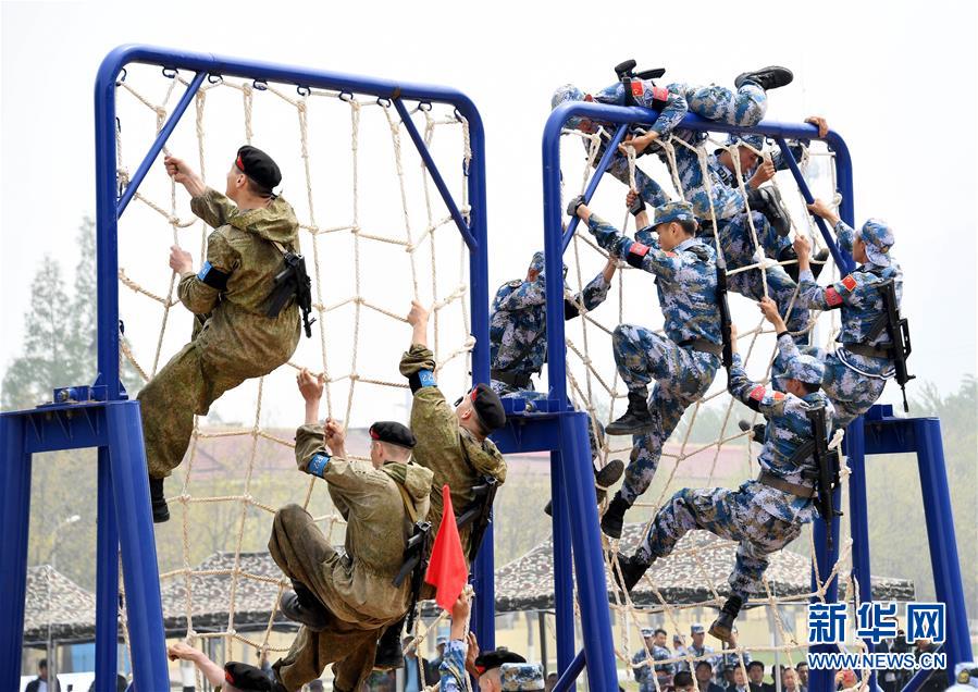 4月30日,中俄海军陆战队员在400米越障竞赛中。 当日,中俄“海上联合—2019”军事演习陆战分队军事竞赛举行。中俄两国海军陆战队员就步枪精度射击、战斗射击、狙击枪射击及400米越障等4个课目进行竞赛。 新华社记者 李紫恒 摄