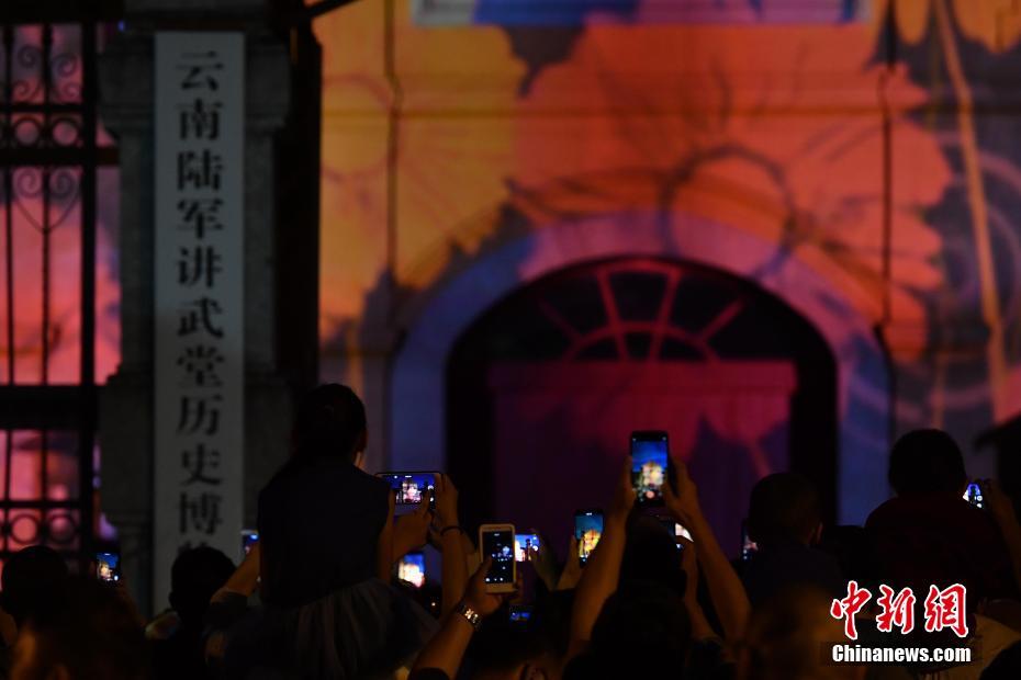 五一节期间,云南陆军讲武堂上演实景灯光3D秀,吸引民众驻足观看。云南陆军讲武堂于1909年8月正式开学,是中国近代史上一所著名的军事院校,与黄埔军校齐名。先后培养了以朱德、叶剑英、龙云等为代表的300余名将帅。图为5月2日晚,市民用手机拍下美轮美奂的场景。 中新社记者 刘冉阳 摄